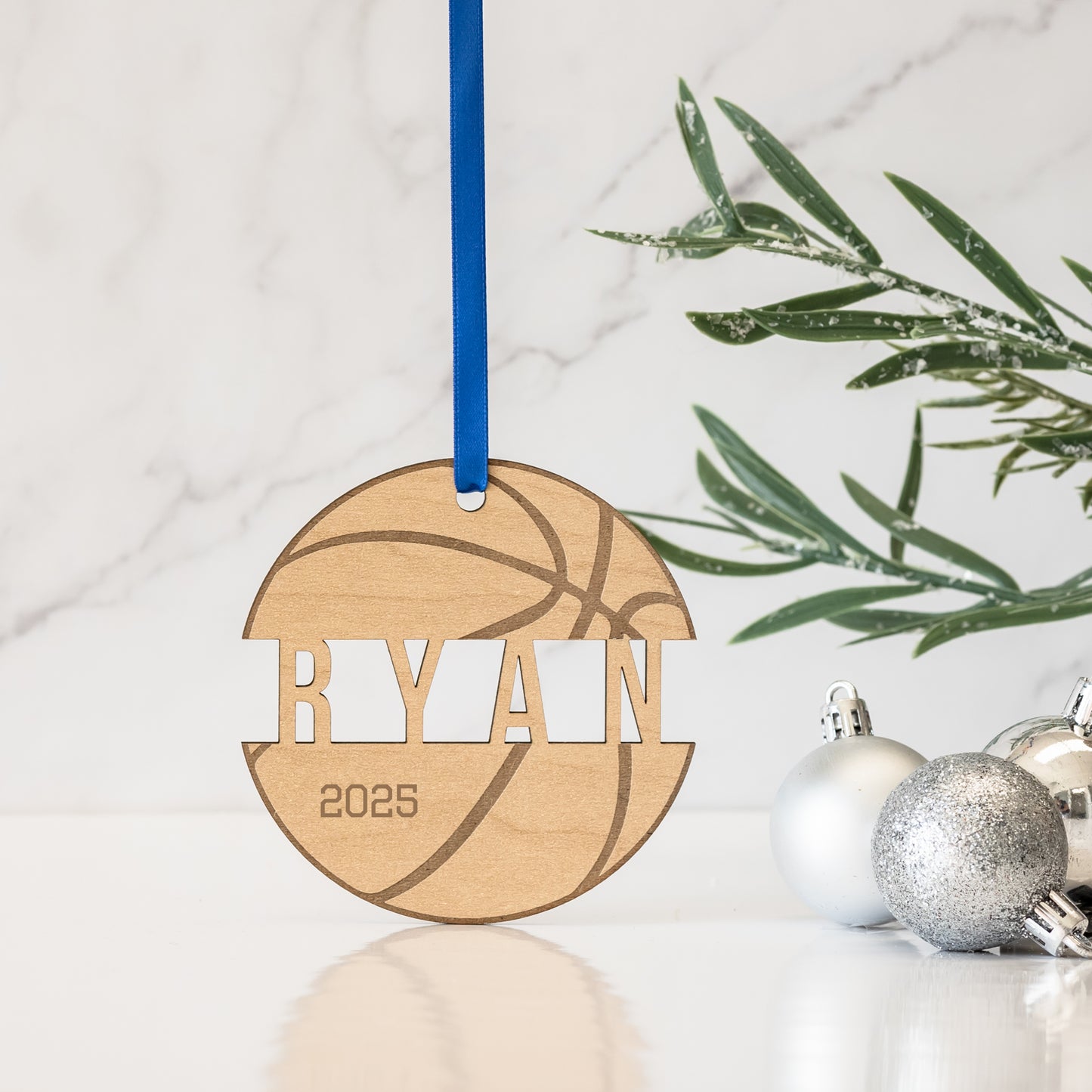 This engraved wooden basketball ornament features the child/athlete's name cut out of the middle of the ball and the year engraved underneath. Team logo/name can be added upon request. Please include name(s) of child/athlete in custom notes area. Ribbon colour may be able to be changed to match team affiliation (upon request).