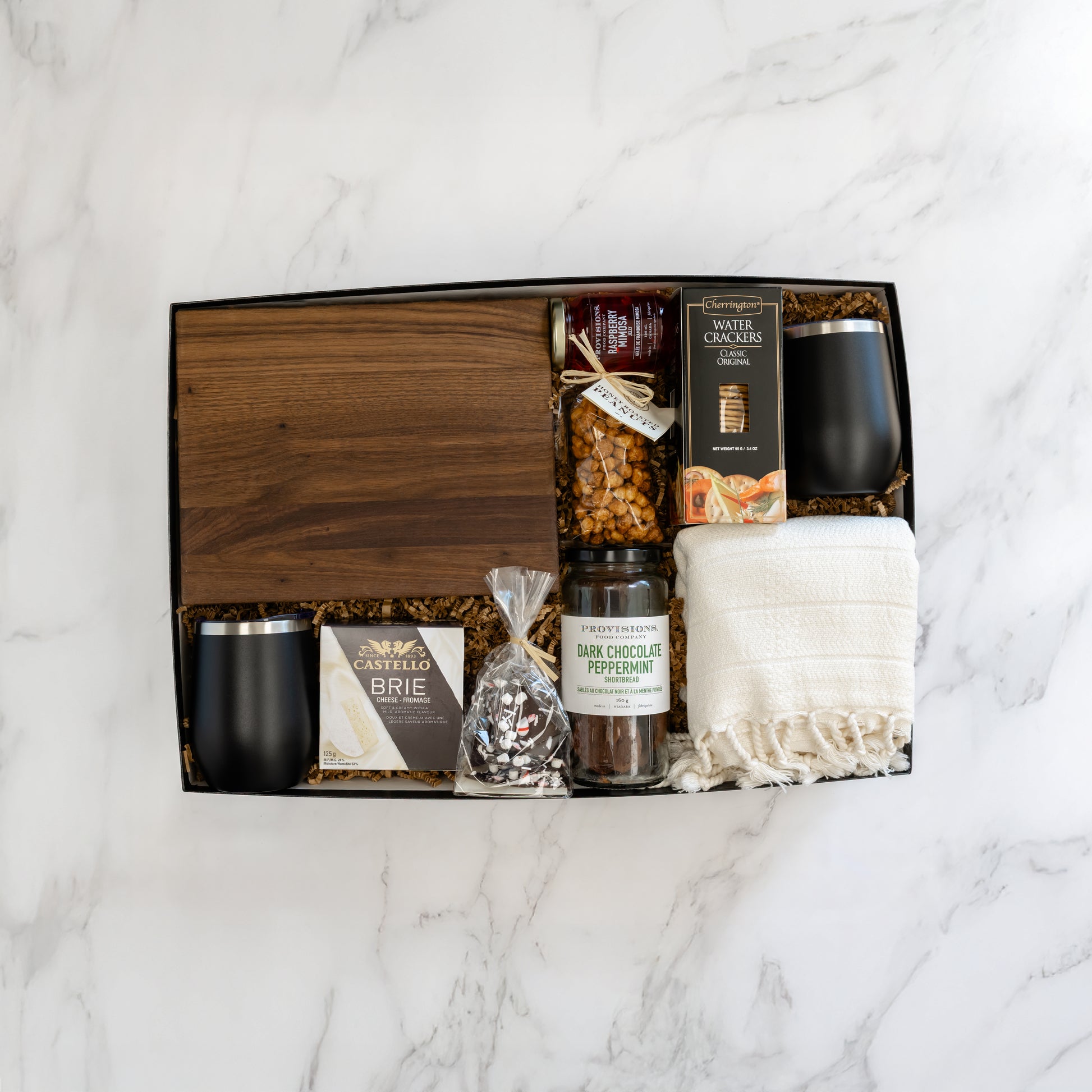 Whether it's a host(ess) gift or a gift for the person/family who loves entertaining, this one is a keeper! With personalization options on the board and wine tumblers, this box will be super special to whomever receives it!