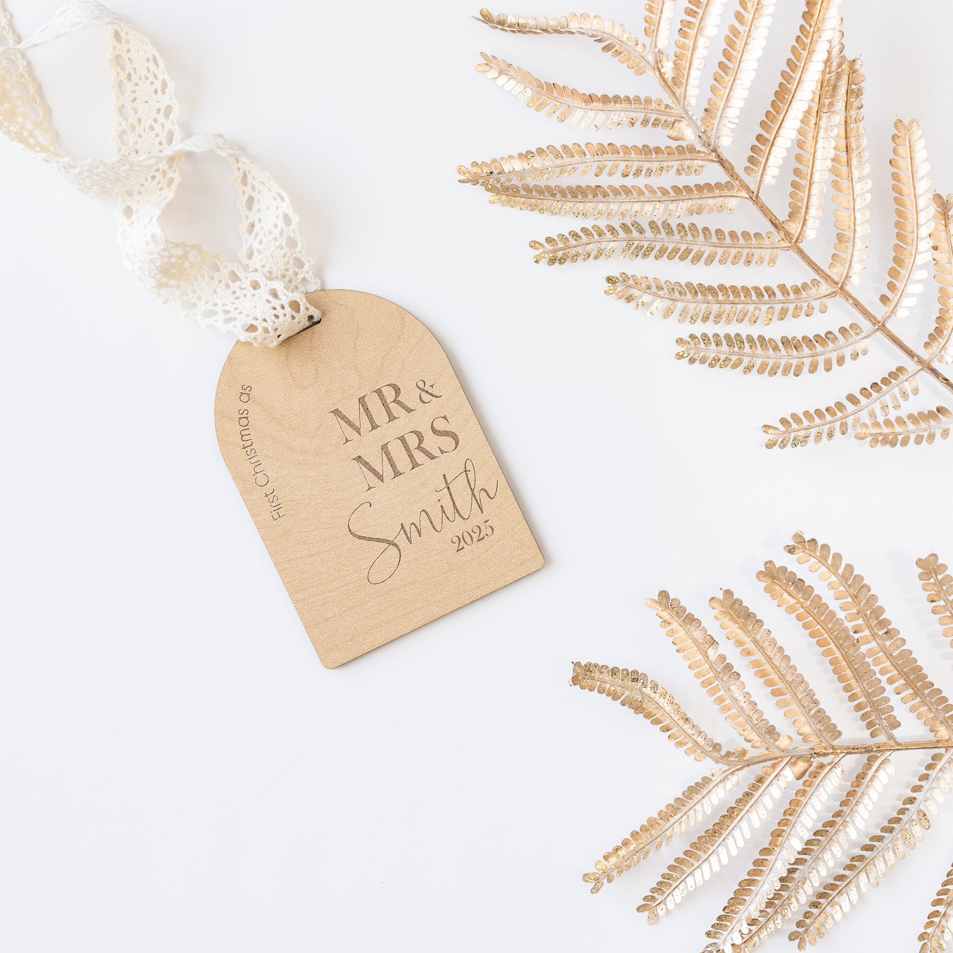 This wooden engraved ornament features the text "our first Christmas as" and the requested prefixes and last name with the year underneath. Please include the prefixes requested and last name in the custom note section.