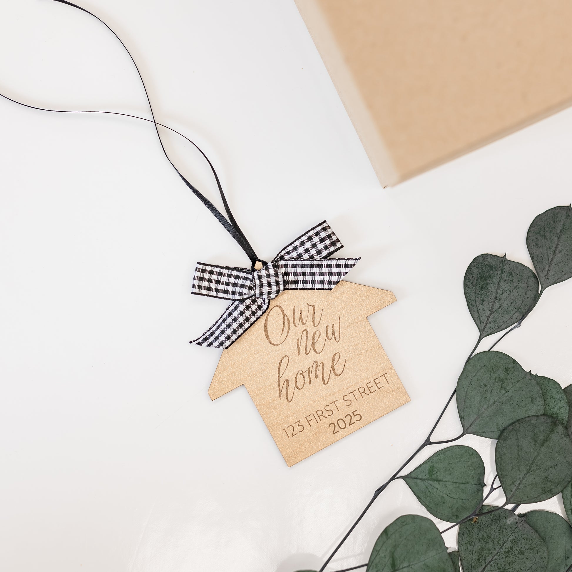 This wooden engraved ornament in the shape of a house celebrates the ownership of a new home with both the address and year engraved. Please include address(es) to be engraved in the custom note section. (note: "our" can be changed to "my" - please just include this in order notes if necessary).