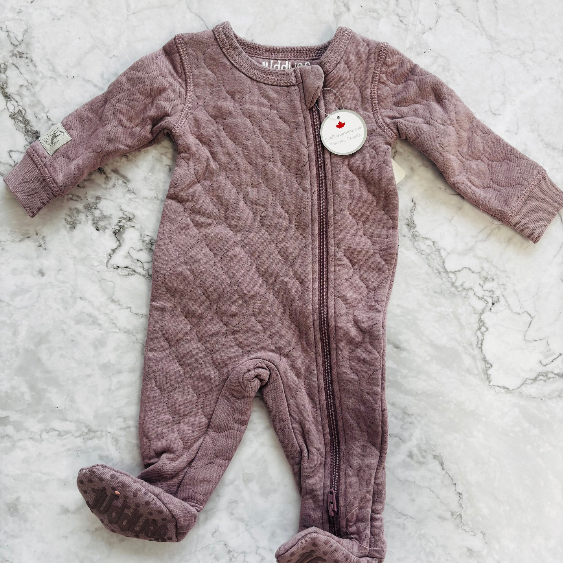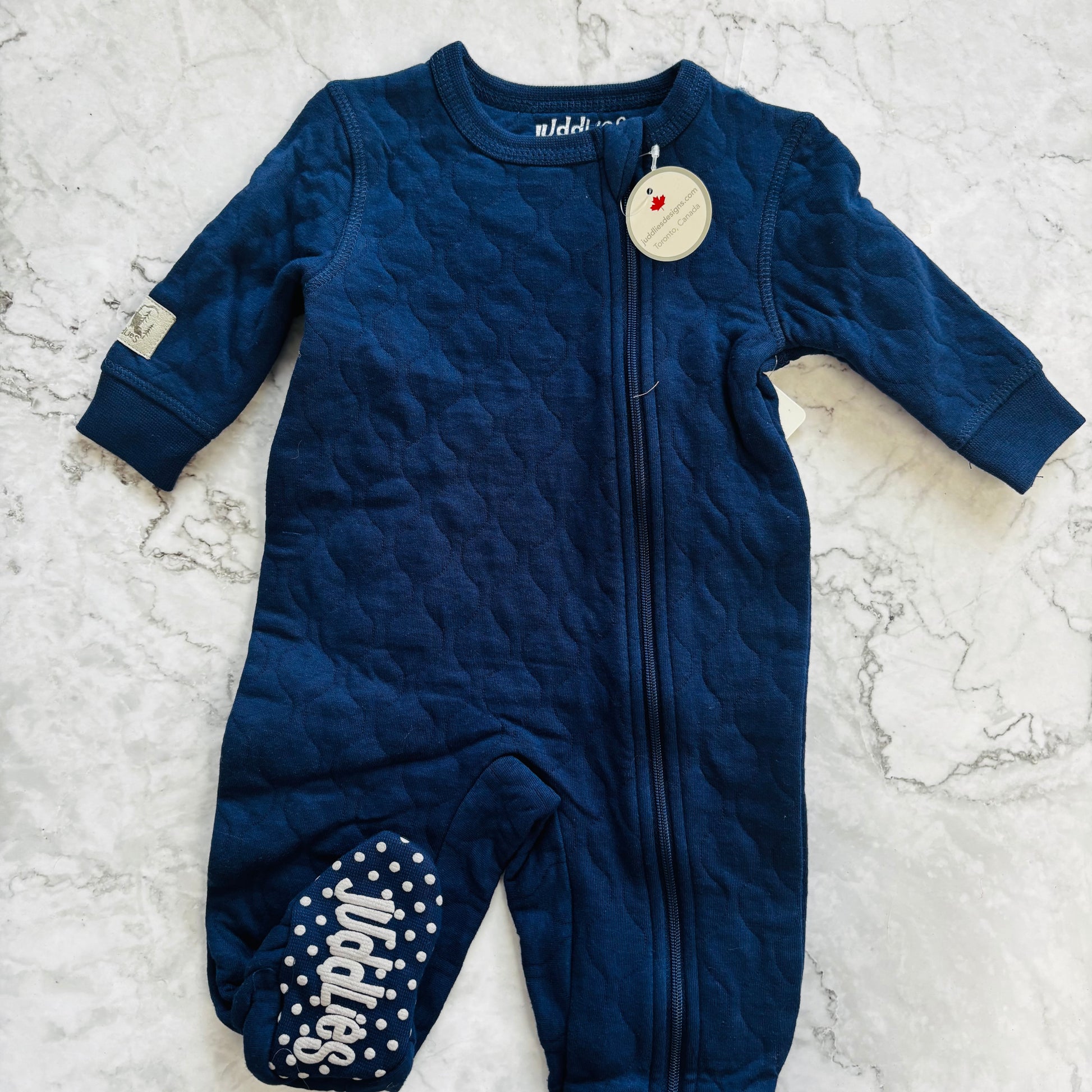 Made by Juddlies, these quilted sleepers are super soft and cozy. Purple is size NB and navy is 0-3 months.